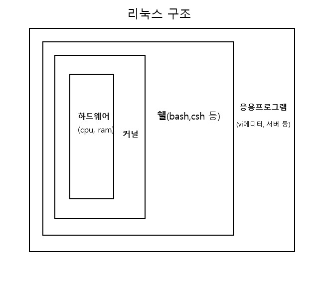 - 리눅스 구조는 크게 3가지로 나누어져있다. ( 커널, 쉘, 응용프로그램 )