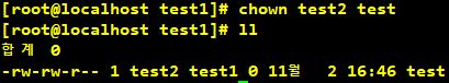 # chown test2 test 명령어를 입력하게 되면 test파일의 소유자가 test2로 바뀝니다.
