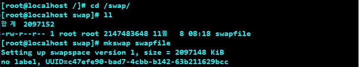 # dd if=/dev/zero of=/swap/swapfile bs=1024 count=2097152 명령어로 2GB짜리 swapfile 생성합니다.
