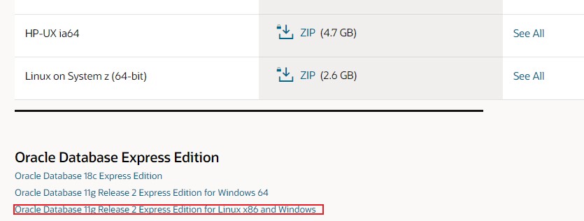 ③ 아래로 내려가시면 Oracle Database Expree Edition이 있습니다. 표시된 부분을 클릭하시면 됩니다.