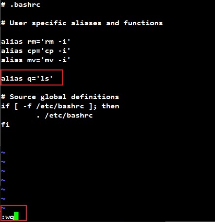 파일 안에 위에서 입력한 # alias q='ls' 를 입력해주시고, # :wq 를 통해 저장 후 나오시면 됩니다.