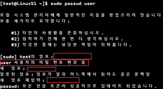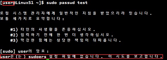 # sudo passwd user 명령어로 관리자 권한 얻고 user계정 비밀번호 바꾸겠다.