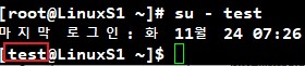이제는 su(switch user)명령어를 통해 test계정으로 들어가봅니다.