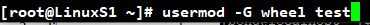 # usermod -G wheel test 명령어로 test계정을 wheel 그룹을 보조그룹을 설정하였습니다.