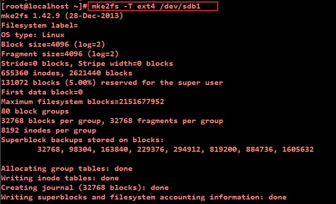 # mke2fs -T ext4 /dev/sdb1