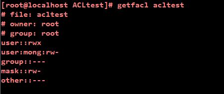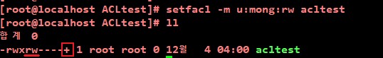 # setfacl -m u:mong:rw acltest 명령어로 acltest파일에 acltest란 유저가 rw권한을 가지게 됩니다.