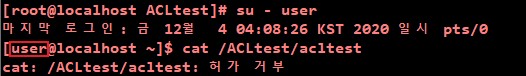 다른 계정인 user로 접속하여 acltest파일을 읽으려고 시도했지만 허가 거부가 났습니다.