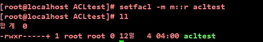 # setfacl -m m::r acltest 명령어로 acltest파일에 ACL mask권한을 r부여했습니다.