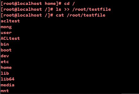 # ls > /root/testfile 유저 목록 출력해서 testfile에 출력값 넣기