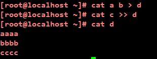 # cat c >> d 명령어로 c 파일 내용을 d로 추가 (이어 붙임)