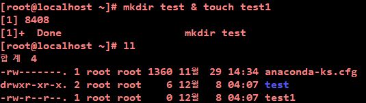 백그라운드로 앞의 명령을 실행시켰기 때문에 test디렉토리 만들기전에 뒤 명령어가 실행되기 때문)