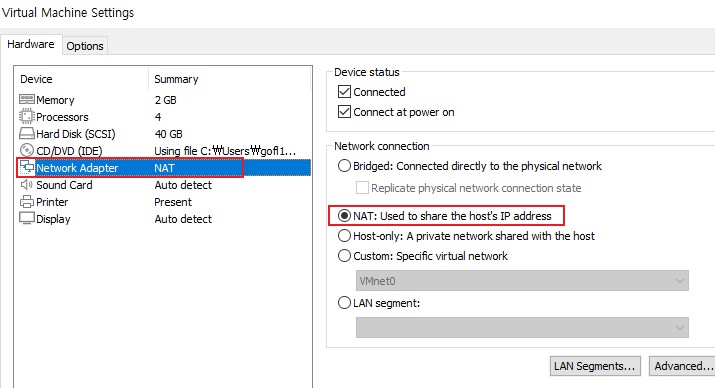 혹시나 VMware NAT타입 vmnet8로 설정되어 있지 않으신 분들은 아래 화면처럼