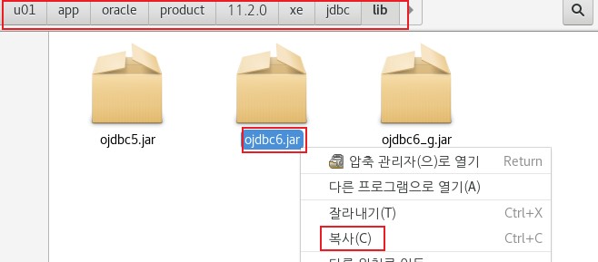 7. 경로를 따라가서 ojdbc6.jar 문서를 복사해줍니다.