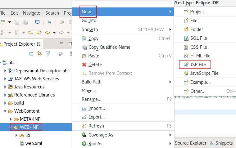 1. WEB-INF 우클릭하여 New -> JSP File 클릭