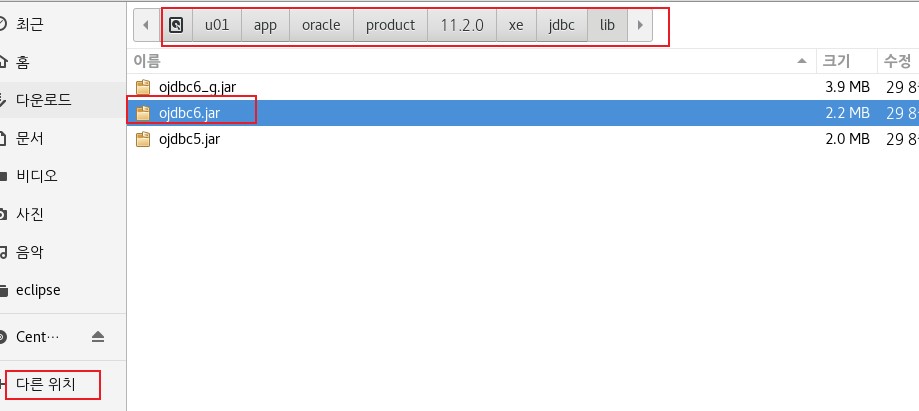 다른 위치 클릭 -> 내 컴퓨터 클릭 후 위에서 찾은 ojdbc6.jar가 있는 위치로 이동하도록 하겠습니다.