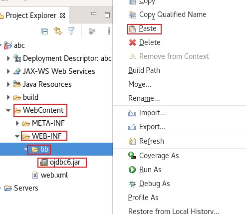8. 이클립스 화면으로 돌아와서 WebContent -> WEB-INF -> lib 폴더에 붙여넣기를 합니다.